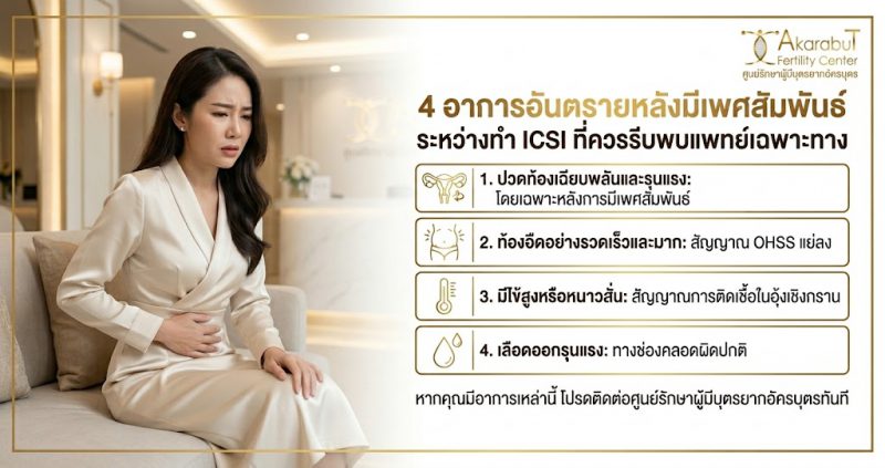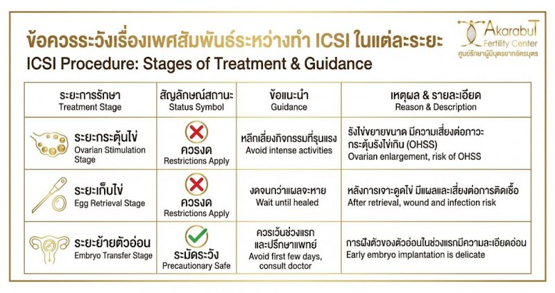 การรักษาภาวะมีบุตรยากด้วยวิธี ICSI ต้องอาศัยความละเอียดอ่อนทั้งทางร่างกายและจิตใจ การปรับความเข้าใจและสื่อสารกันอย่างเปิดเผยระหว่างคู่สมรสเกี่ยวกับข้อจำกัดทางเพศสัมพันธ์ในช่วงนี้ จะช่วยลดความกังวลและสร้างกำลังใจให้กันและกันได้เป็นอย่างดี โปรดจำไว้ว่าการงดมีเพศสัมพันธ์เป็นเพียงมาตรการชั่วคราวเพื่อเป้าหมายที่ยิ่งใหญ่กว่า นั่นคือความปลอดภัยของคุณแม่และการถือกำเนิดของลูกน้อยที่สมบูรณ์แข็งแรง